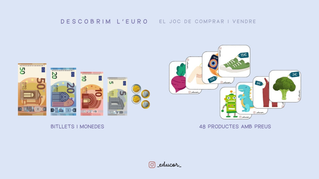 Amb Descobrim l’euro: el joc de comprar i vendre, els infants s’endinsen en el món dels diners tot posant en pràctica el càlcul, el raonament i la comunicació d’una manera vivencial i divertida.
