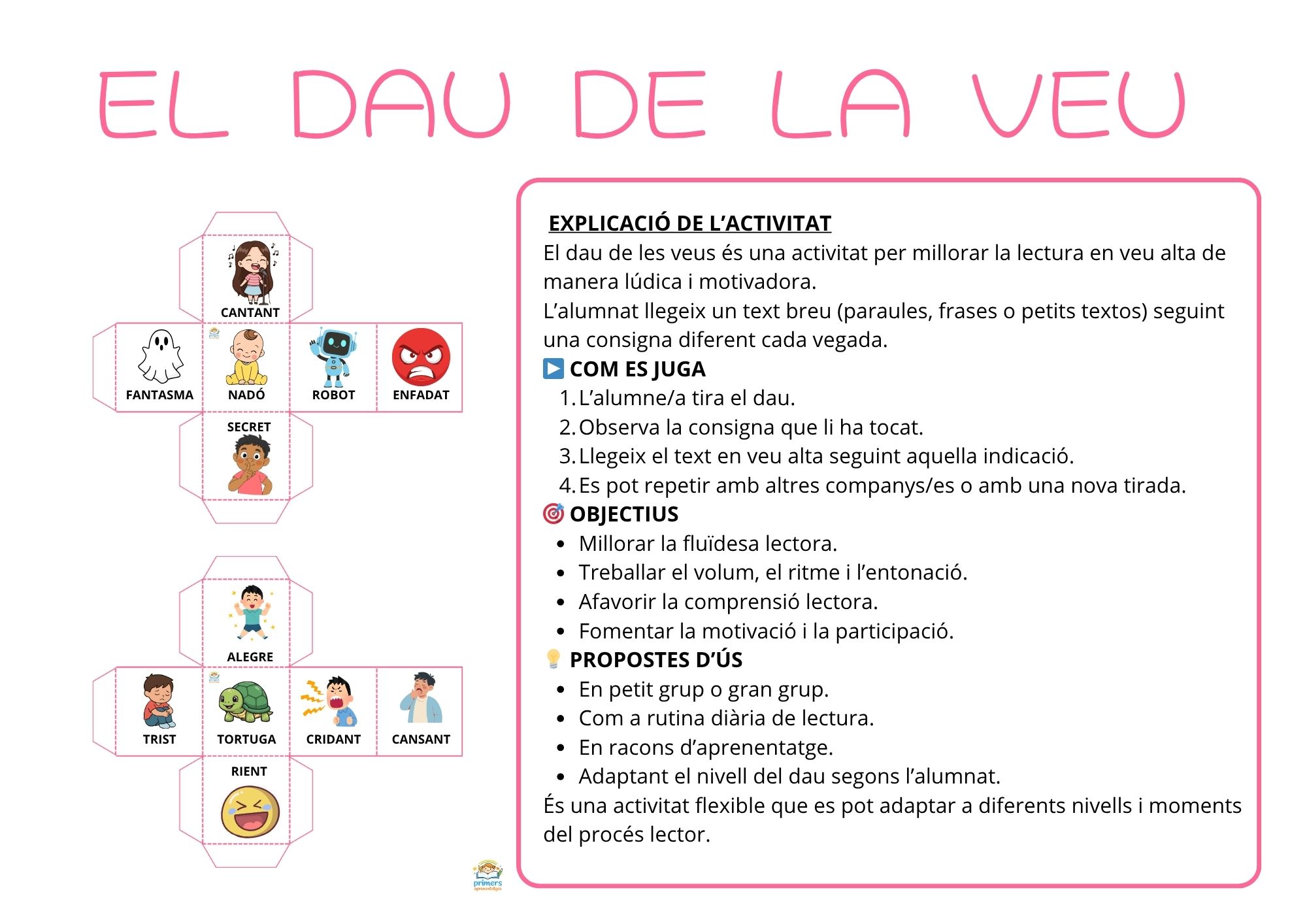 Descobreix "El Dau de la Veu", un material divertit i motivador perquè els teus alumnes millorin la seva lectura en veu alta. Amb aquesta activitat, cada alumne llegirà un text curt (frases, oracions o petits paràgrafs) seguint una consigna diferent que li indicarà com utilitzar la seva veu.