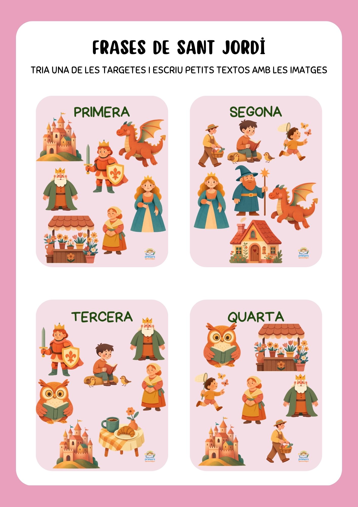 Quatre targetes il·lustrades: Cada una amb escenes úniques de Sant Jordi, plenes de personatges com cavallers, princeses, dracs i reis. Aquestes targetes són el punt de partida perfecte per a la creació de textos.