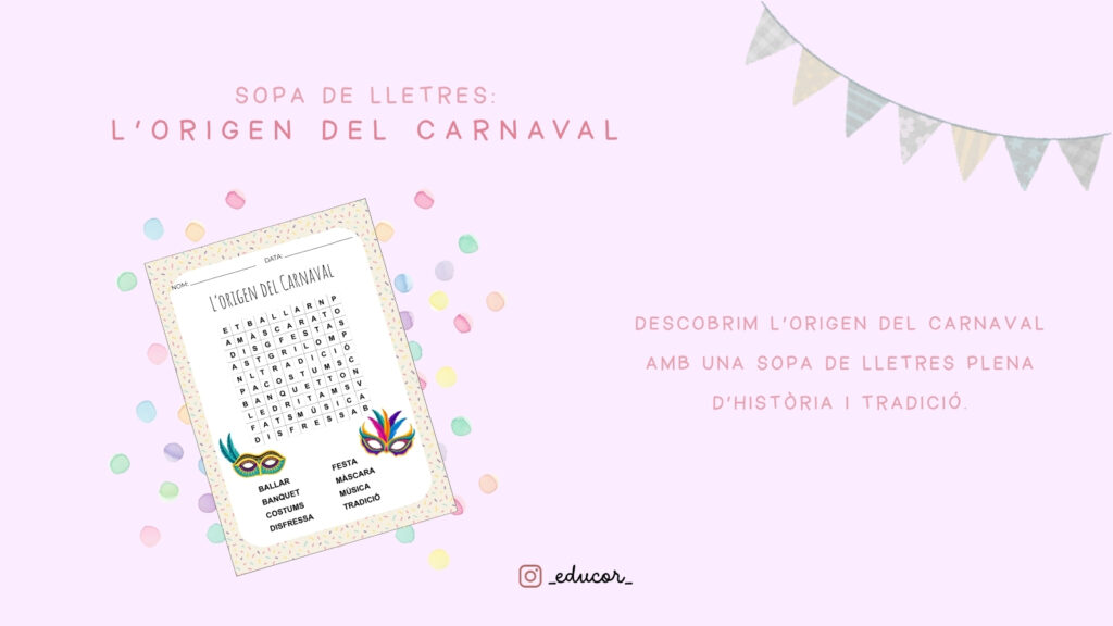 Quan arriba el temps de màscares, disfresses i confeti… és moment de descobrir l’essència de la festa amb la Sopa de lletres: L’origen del Carnaval! 🎭✨