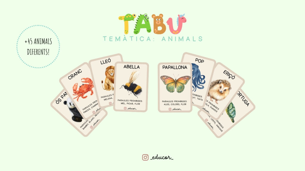 ✨ Més de 45 targetes amb animals i paraules “tabú” que no es poden dir.